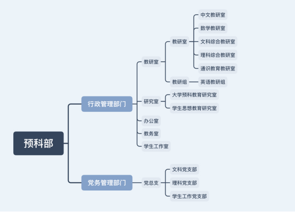 预科部现设五个教研室、一个教研组和两个研究室:中文教研室、数学教研室、文科综合教研室、理科综合教研室、通识教育教研室,英语教研组,大学预科教育研究室、学生思想教育研究室。
